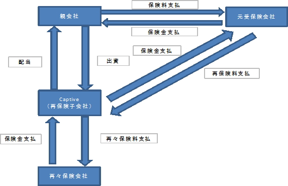 主に以下4点が挙げられます。 ○キャッシュフローの強化 →元受保険会社に支払った保険料と、元受保険会社がキャプティブに支払う再保険料の差額を 収益とすることで、キャッシュがたまります。 ○保険化が難しいリスクへの対応 →特殊リスク等、通常の手法では欲しい内容の保険カバーを手配できないため、自前のキャプ ティブを設立することにより、企業と保険会社がリスクを分け合い、保険化が困難であった リスクをカバーすることができる場合があります。 ○再保険マーケットへのアクセス →キャプティブも改めて再保険を手配するため、国際的な再保険マーケットにおける情報を 入手することができます。 ○リスクマネジメント機能の強化 →キャプティブにおいて、自社グループのリスク管理を一元化することができます。 日系企業における主な設立目的となっています。(3)全体像